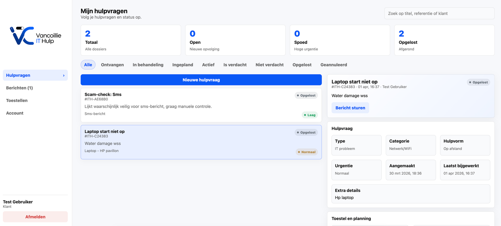 Bekijk de status van lopende en afgehandelde hulpvragen in één overzicht, altijd beschikbaar via de app.